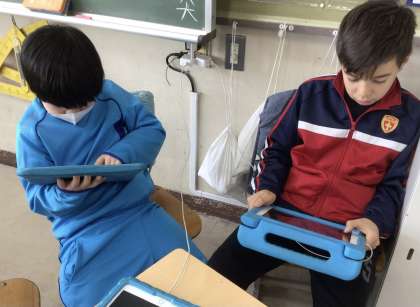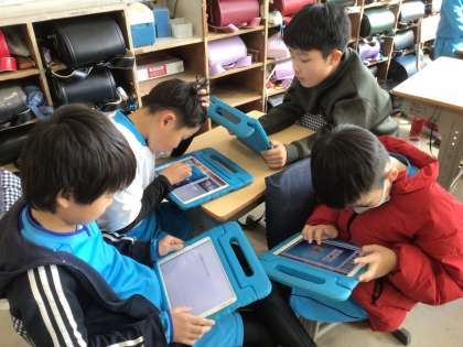 学習用タブレットで、社会福祉についてグループごとのテーマに沿って調べています。パワーポイントを使った資料も完成しつつあります。