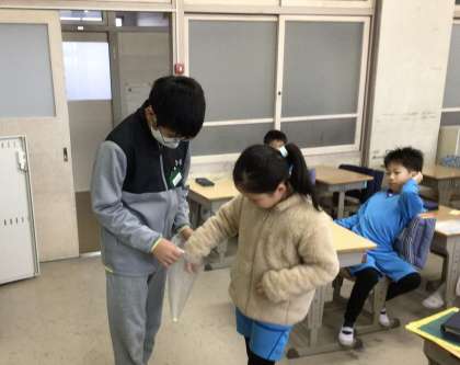 明日までお年玉募金活動が行われています。今朝も、VS委員の6年生が募金活動に来ました。