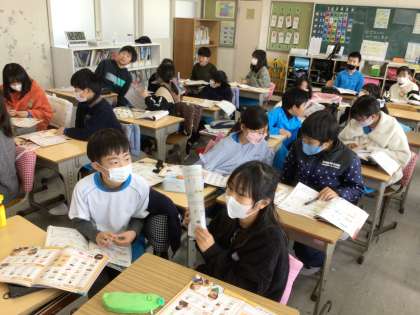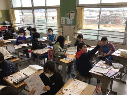 テキストや黒板の板書を確認しながら、ペアで会話の練習です。