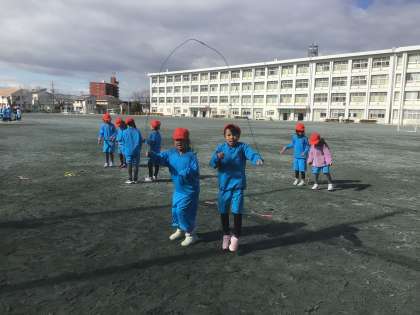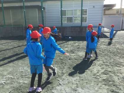 友だちと横にならんでペア跳びをしたり、前後に向かい合ってペア跳びをしたりしました。タイミングを合わせることが難しいですが、声をかけ合って跳びました。