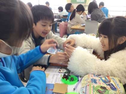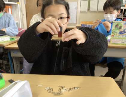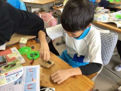 1組の様子です。磁石の実験を行っています。磁石と鉄の距離が離れているほど磁石が鉄を引きつける力は弱くなることが分かりました。