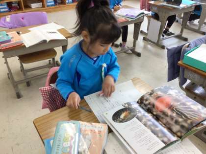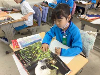 「子どもをまもるどうぶつたち」の学習では、本を読んで自分で選んだ動物のちえについて調べ、まとめています。本から必要な情報を見つけ、一生懸命自分のワークシートに書いていました。