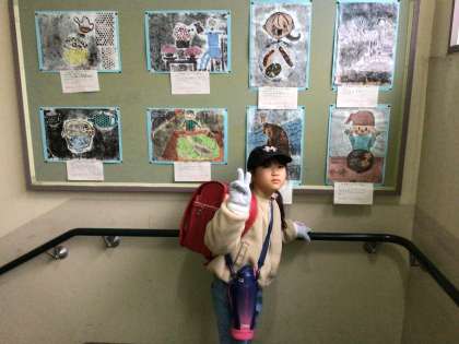 1組の様子です。書き初め展が行われています。図工の掲示もあります。