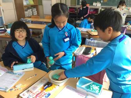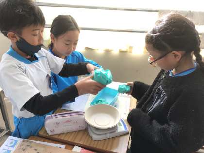 1組の様子です。粘土を使って、形が変わったときの重さについて調べました。形が変わっても重さは変わらないことがわかりました。