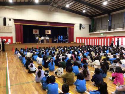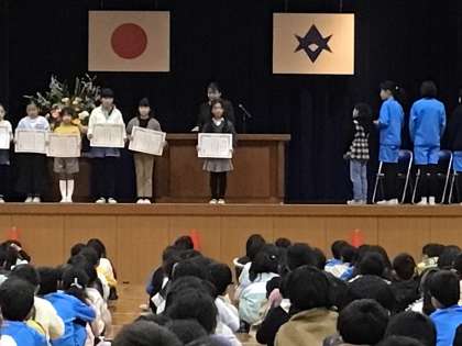 書き初め展の表彰も行われました。最後に、春休みの過ごし方についての話を聞きました。