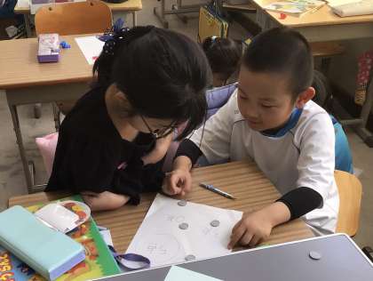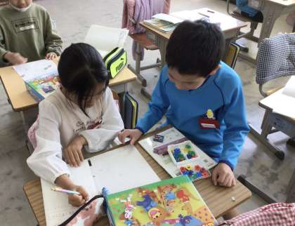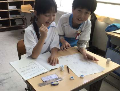 この日は、隣の友だちとおはじき入れを行いました。掛け算を使って得点を計算しました。