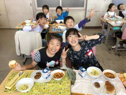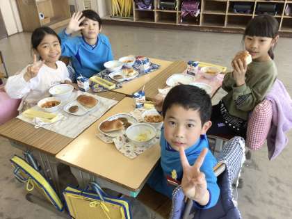 この日のメニューは、ツイストパン、ハンバーグ、ポークビーンズ、コーンスローサラダ、牛乳でした。子ども達の大好きなメニューばかりで、楽しく食べていました。