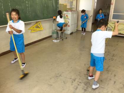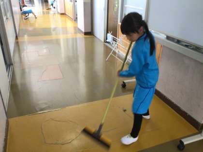 教室・廊下の掃除です。静かに隅々まで綺麗にしています。