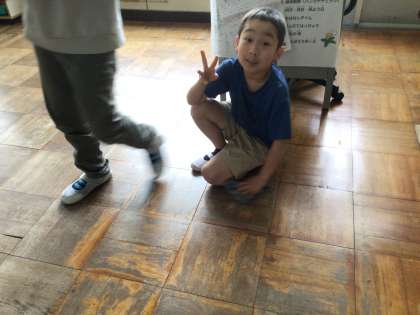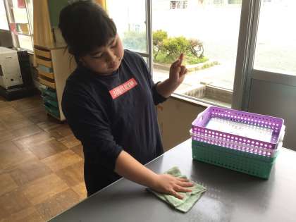 教室掃除の様子です。雑巾で綺麗に机や床を一生懸命に拭いていました。休み時間には、笑顔で過ごしています。