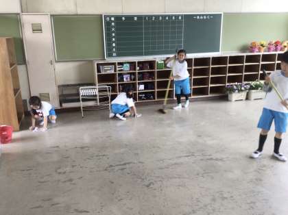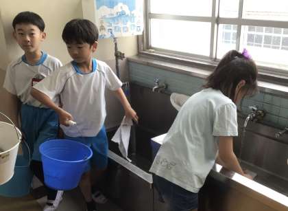 手洗い場、トイレ、特別教室での掃除です。静かに隅々まで綺麗に掃除しています。