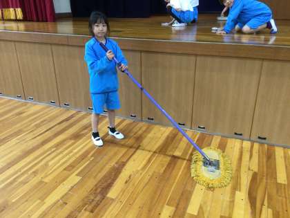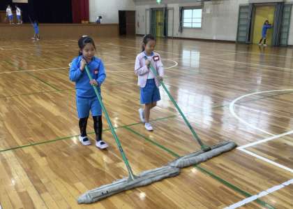 体育館も3年生が掃除をしています。モップや雑巾を使って床を綺麗にしています。