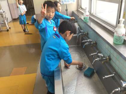 手洗い場の掃除です。掃除も笑顔で進んで行っています。掃除の後はピカピカです。黒板も綺麗に掃除しています。