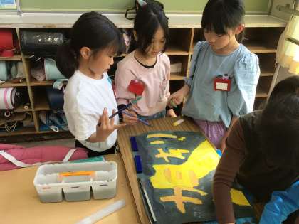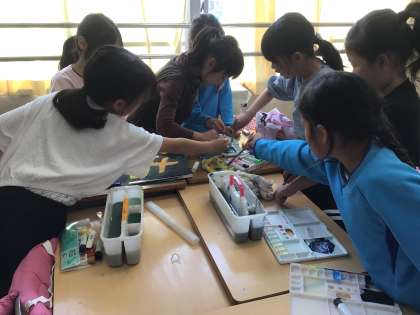 グループごとに、友だちと話し合いながら協力してポスターを作っています。完成したら、教室後方に掲示する予定です。