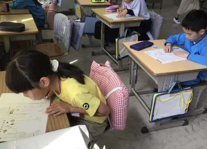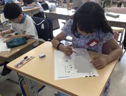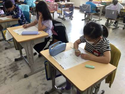 今日は、単元テストを行いました。次の授業は、花壇にあるヒマワリを観察します。