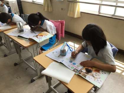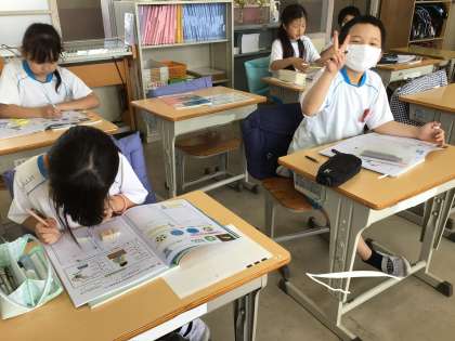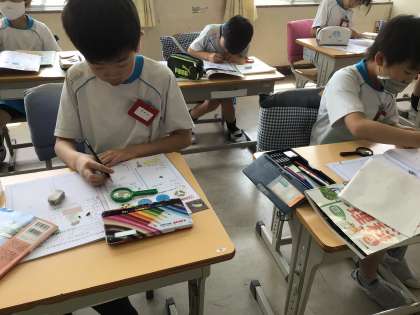 4組の授業です。今日は、タネの観察をしました。ヒマワリ、ホウセンカ、オクラの中から2つ選んで理科ノートの観察カードを作りました。大きなヒマワリのタネは、模様の線一本一本丁寧にかきました。ホウセンカのタネは小さくて虫メガネを使っても模様の線を観察することが難しかったようです。