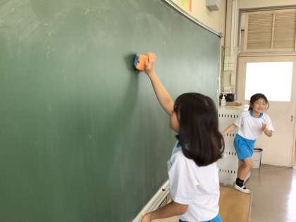 教室の様子です。ほうき担当者が丁寧にゴミを集めた後に、ぞうきん担当者が隅々まで綺麗に拭いています。