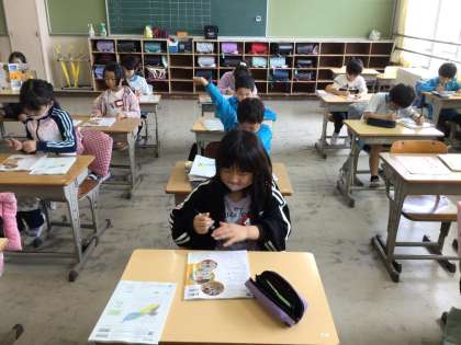 教室では、3年生で使う教科書が配られました。自分の名前を書いています。まだ、教室掲示がなく、これからみんなでクラスを作り上げていくところです。