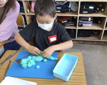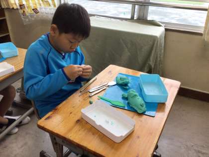 今日は、粘土を使って好きなものを作りました。ヘラを使って切ったり、かき出したりして作品を完成しました。