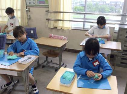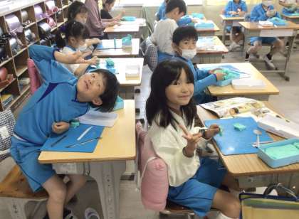 1組の授業です。ヘラを使って切ったり、かき出したりして粘土で作品を作りました。