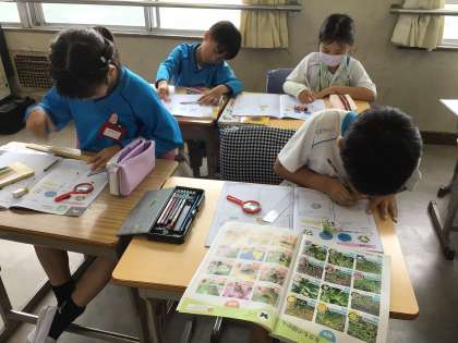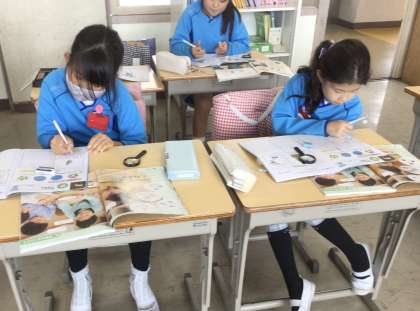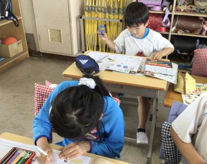 3組の授業です。虫メガネを使って植物のタネの観察をしました。理科ノートに観察したことをまとめました。花の種類によって、タネの大きさ、色、模様、形が異なることがわかりました。