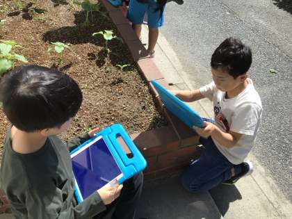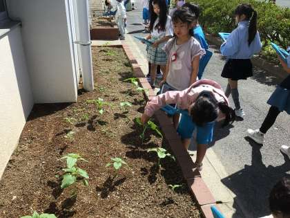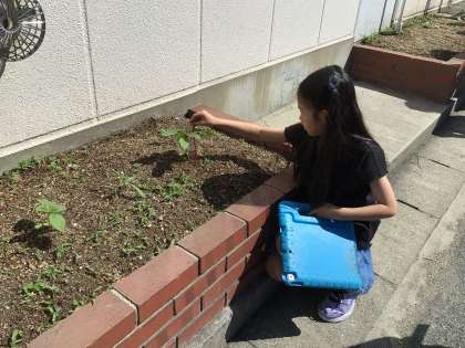3組の授業です。ヒマワリを観察するために花壇に行きました。。今日は、最初に出る子葉の観察をしました。定規を使って高さも計りました。