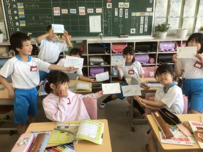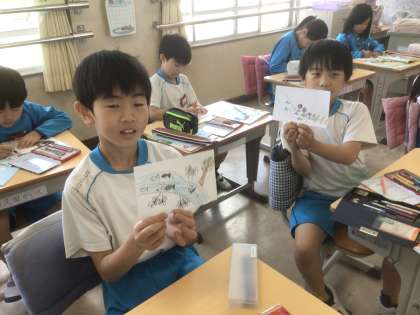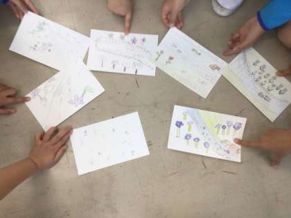 「春の小川」という曲を聴いて、イメージした絵を描きました。みんなで絵を見合い、春のイメージをふくらませました。やさしい感じでうたうといい、流れるようになめらかにうたう、などみんなで伝え合いました。