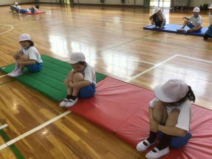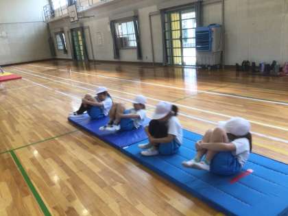 マット運動では、前転、後転、そして、側方倒立回転に挑戦してみましたが、思うように体が回転しなかった様です。練習あるのみですね!まずは、体を丸めてみました。
