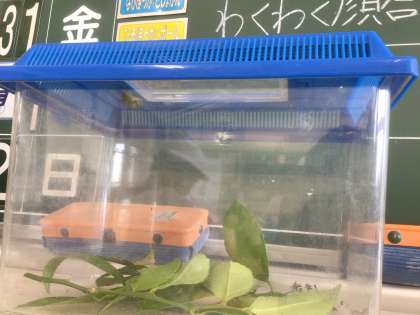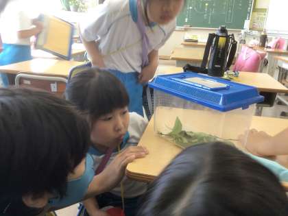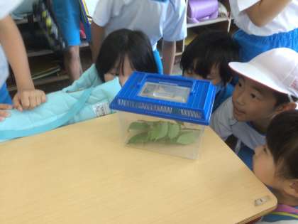 お友達がもってきてくれたアゲハの幼虫が、姿を変え始めました。体から糸が出ています。「なになに?」と、みんなで虫かごをのぞきこんでいます。