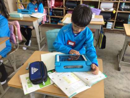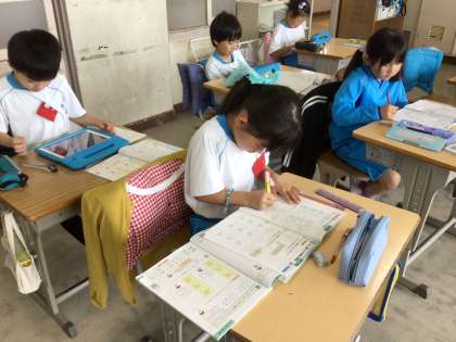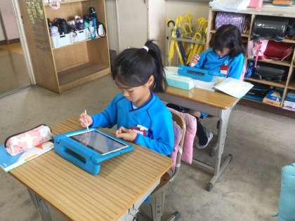 教科書の引き算の筆算の練習問題を解いています。早く終わった子は、学習用タブレットの練習問題に取り組んでいます。