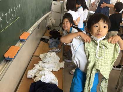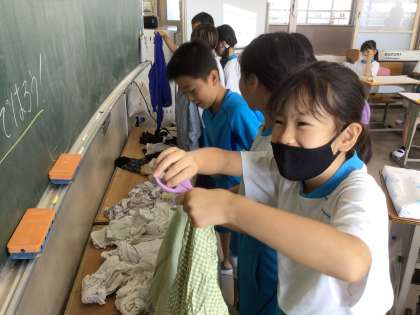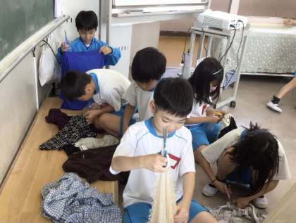 必要な布をハサミで切り取っています。切り取った布を画用紙に貼ってデザインしていきます。