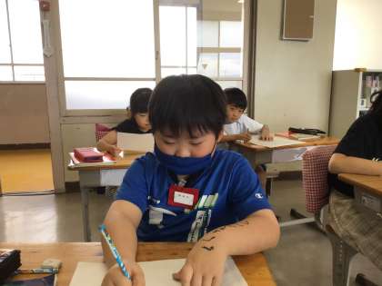 1組の様子です。自分の説明文を書いています。下書きメモを見ながら、自分のことがよく伝わるように考えながらまとめています。