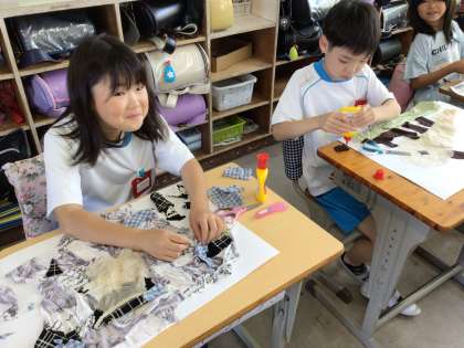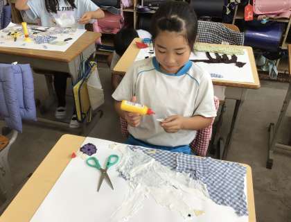 1組の授業です。今日も布を切ったり貼ったりして作品を作っています。大きな動物を表現している子が多いです。