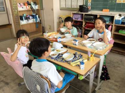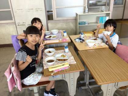 この日のメニューは、ご飯、豚汁、ししゃもフライ、青菜あえ、牛乳でした。