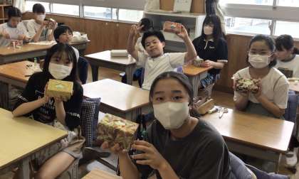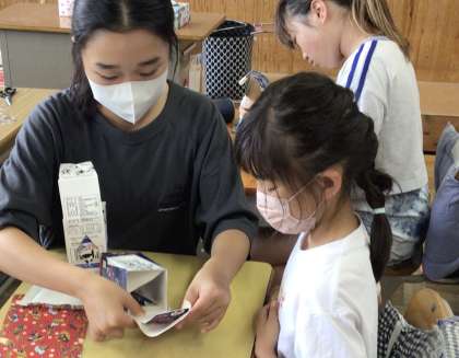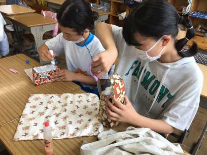 今日のクラブでは、牛乳パックでミニティッシュBOXを作りました。講師の方々と共に、牛乳パックに和紙を貼り、実用的な箱を作りました。貼り方が難しいところを、5年生にサポートする姿もありました。どの子の作品も、素敵です。家庭で活用してくださいね。