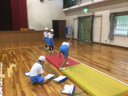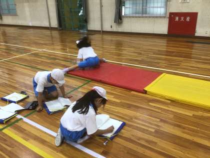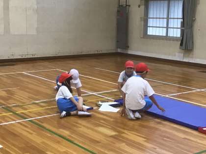 「マット運動」の学習です。今日は、連続技の練習です。どの技を組み合わせようか、試したり友だちと相談したりしています。