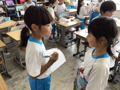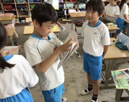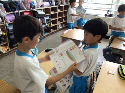 1から20までの数字を英語で表現しています。How many apples?と聞きながら、自分と同じ数だけのリンゴに色を塗った友達を探しました。