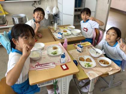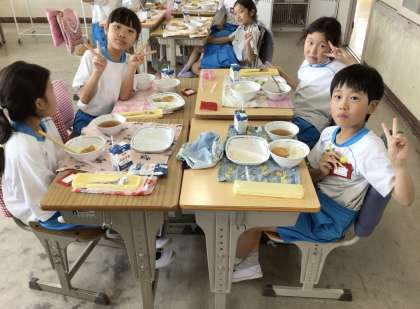 給食の時間が大好きな子ども達です。笑顔で美味しくいただきました。