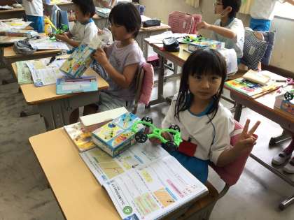 今日から、ゴムと風の力のはたらきの学習になります。実験で使う車を組み立てました。