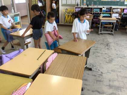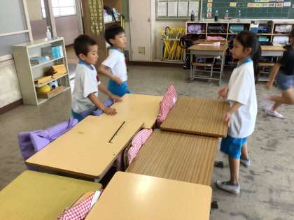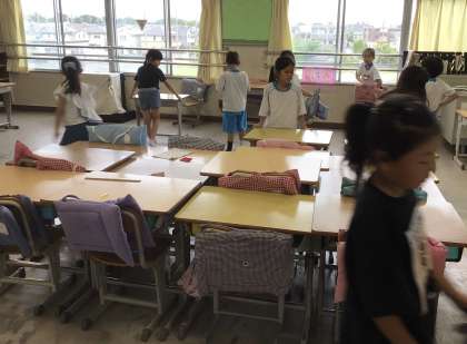 机をコの字型に配置してあるので、机を移動する場所を工夫しています。静かに掃除をしていて素敵です。