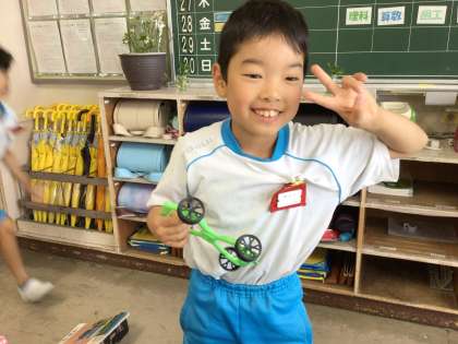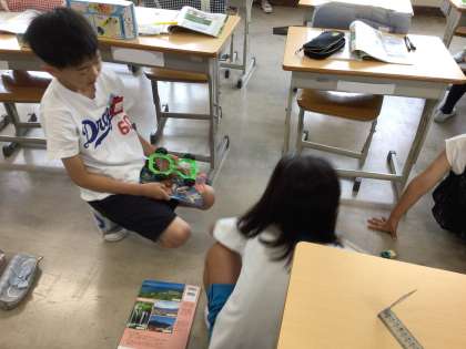 4組の授業です。車の走り方を調べました。教科書や筆箱などを使って障害物を作っていました。