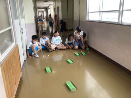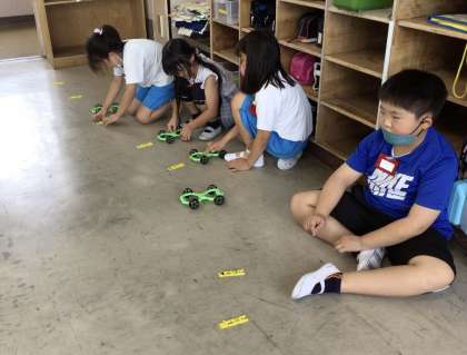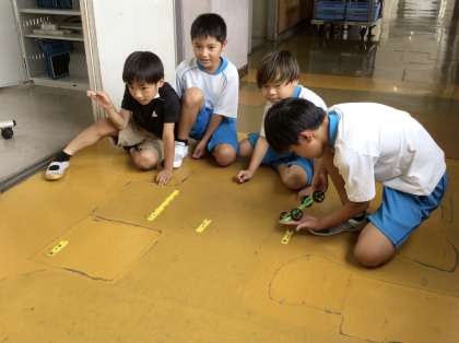 1組の授業です。ゴムで動く車がちょうどゴールで止まるように、ゴムを引っ張る長さを変えながら車を走らせました。