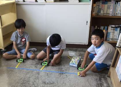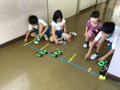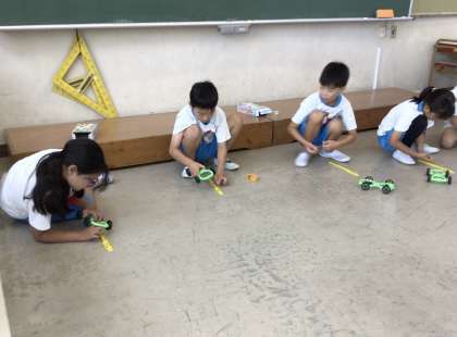 4組の授業です。ゴムの長さを変えながら、車の進む長さを測定しました。