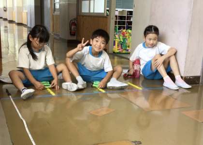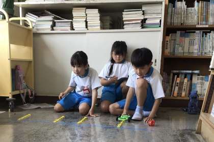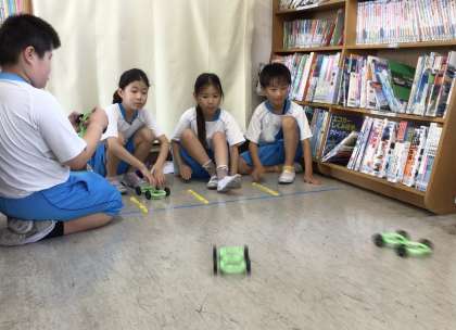 3組の授業です。図書館や廊下でゴムの力で走る車を使って実験をしました。