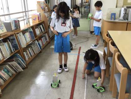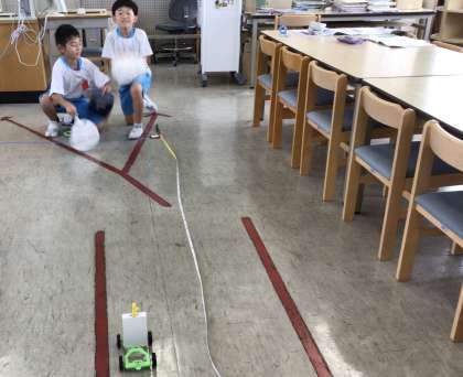 1組の様子です。教室や図書館で風の力を使って車を動かしました。うちわや送風機で風の強さを変えて実験しました。実験の結果から強い風の方が車の進む距離が長いことに気付きました。