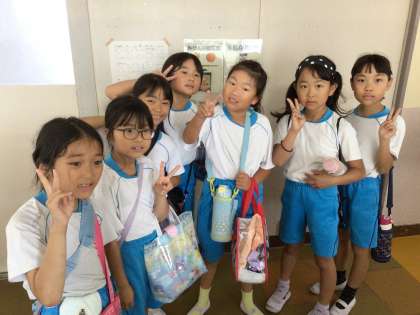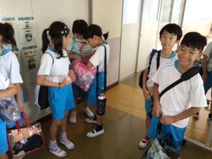 体育の授業に参加するために整列しています。子ども達はプールの授業をとても楽しみにしています。