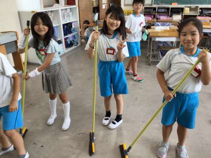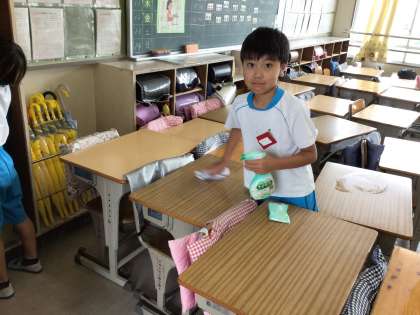 教室の掃除です。雑巾は、バケツに汲んだ水で洗っています。