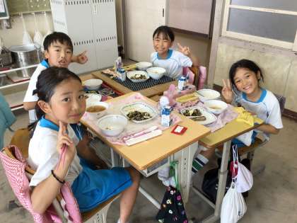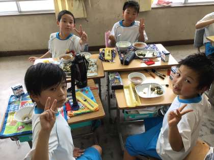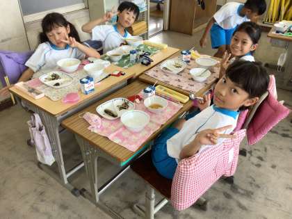 この日のメニューは、ご飯、かみなりじる、いわしのしょうが煮、骨太サラダ、牛乳でした。
