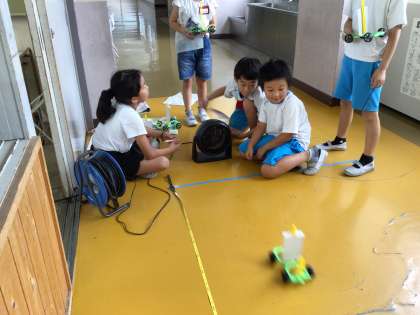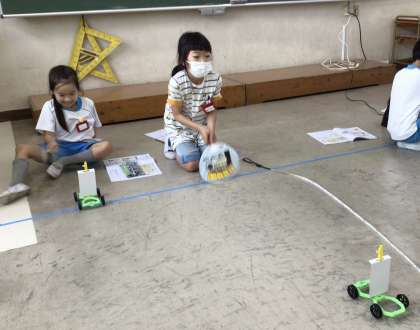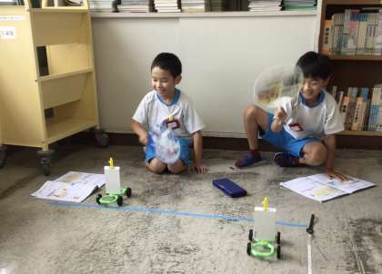 風の力のはたらきです。うちわや送風機を使って車を動かしています。