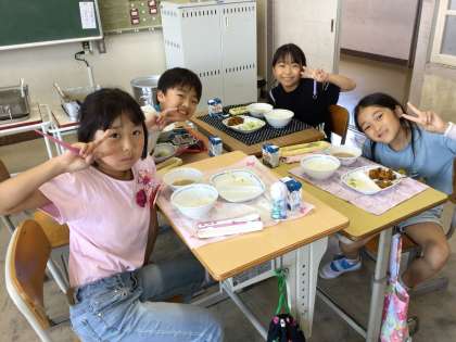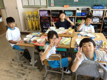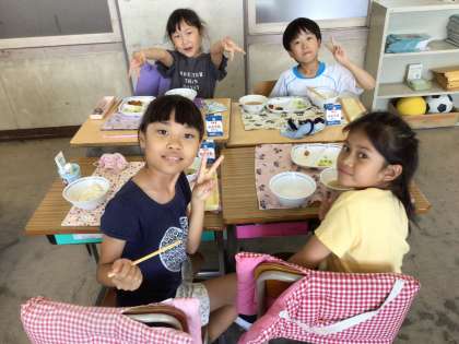 今日のメニューは、ご飯、夏野菜のゴマみそ汁、レバーとカボチャの甘辛煮、枝豆サラダ、牛乳でした。枝豆サラダが1番人気ですぐになくなりました。