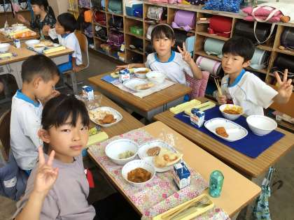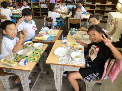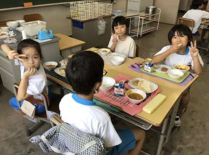 夏休み直前のメニューは、ナン、チキンカレー、たらフライ、コールスローサラダ、牛乳でした。ナンにチキンカレーをつけて食べました。たらフライもコールスローサラダもとても大好評でした。